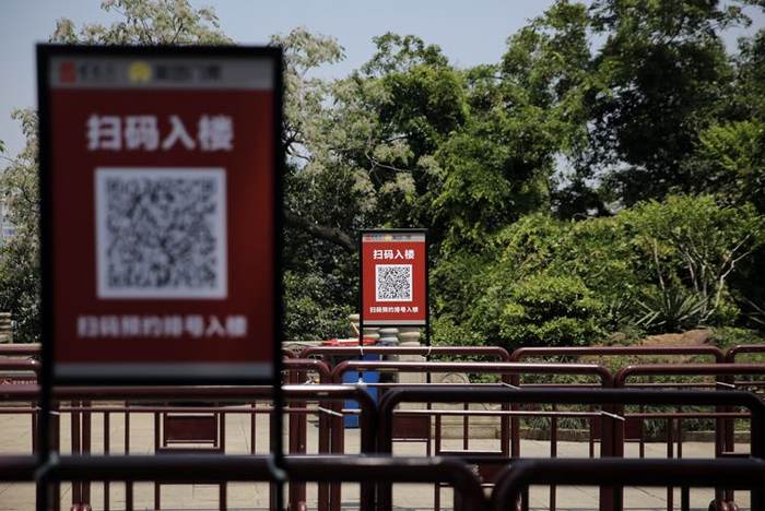 黄鹤楼主楼入口处,“健康扫码”标识。
