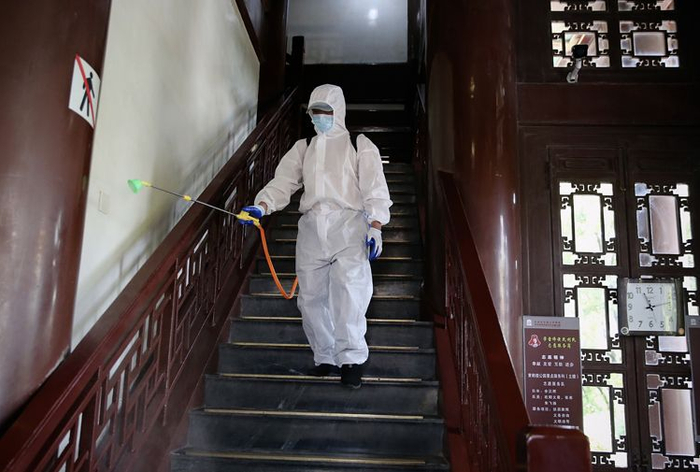 工作人员消毒黄鹤楼主楼通道。