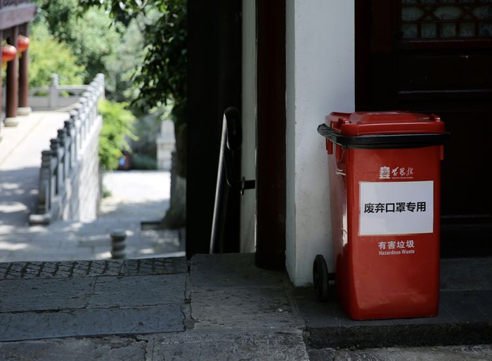 黄鹤楼公园内放置了废弃口罩专用垃圾桶。