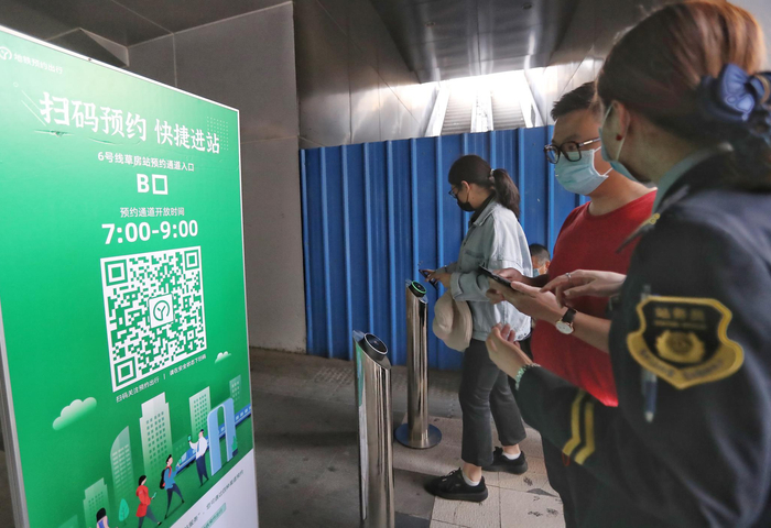 今天早上7点30分,记者在6号线草房站B口外看到,两台预约进站扫码机已经启用,不少已经申请好预约进站码的乘客正在工作人员的引导下有序通过。