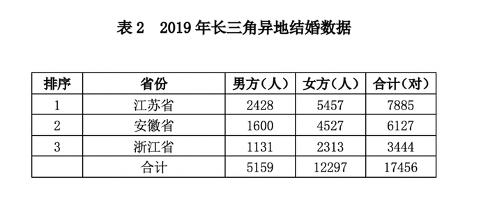 统计显示,2019年全市办理异地结婚登记39951对。其中,当事人一方为长三角地区江苏省、浙江省、安徽省的登记数量共有17456对,占全部异地结婚登记总数的43.69%,占本市内地居民结婚登记总数的17.92%。在全市办理的异地结婚登记中,数量居前三位的依次是江苏省、安徽省、浙江省。相关专家表示,长三角三省异地结婚登记数始终排在上海与全国各省异地结婚登记数的前三位,佐证了长三角三省一市“地域相近、人文相亲”的家庭融合特征,是长三角一体化在婚姻家庭方面的反映。
