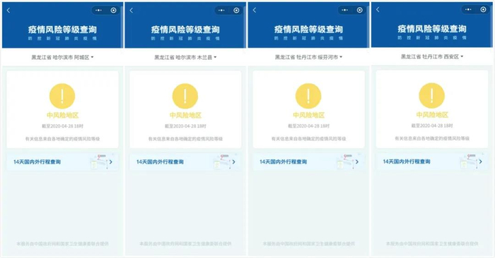黑龙江省哈尔滨市道里区、南岗区、道外区、呼兰区、阿城区、木兰县,牡丹江市绥芬河市、西安区属于中风险地区。