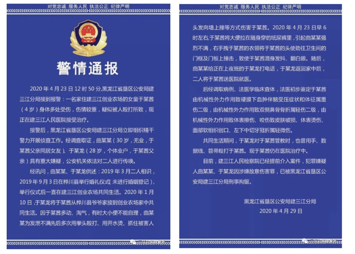黑龙江省垦区公安局建三江分局29日中午通报,由于父母离异,今年1月,茜茜跟随生父于某龙及其同居女友曲某某一起生活。短短3个月的时间,茜茜遭到“继母”、生父多次殴打。曲某某为发泄不满多次用拳头殴打、用开水烫、抓住头发向墙上撞等方式伤害茜茜,于某龙对茜茜进行管教时,曾用手、数据线、笤帚殴打茜茜。