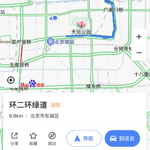 今天下午,记者打开手机百度APP搜索“环二环绿道”,一条起止点分别为北京先农坛体育场附近和德胜门西大街的蓝色路线就显示在地图中,串联起沿途的天坛公园、龙潭公园、地坛公园、北滨河公园等公园景区。