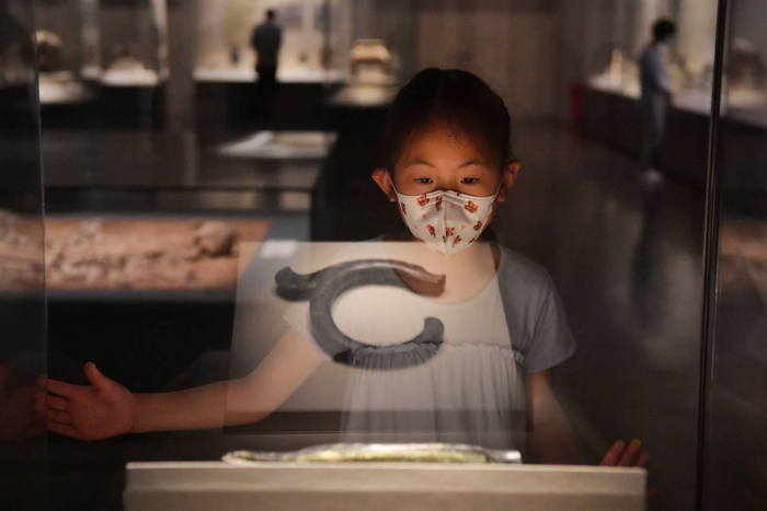 来自北京的顾先生一家对古代中国展最感兴趣。顾先生说,他们一家都是国博的忠实粉丝,平时只要有空就会带孩子来看展,疫情期间展馆关闭,给两个孩子“憋坏了”。限流期间来看展,终于可以把古代中国展好好地看一遍了。