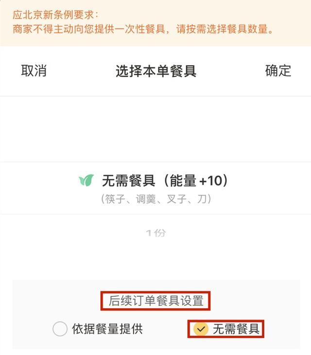 近日刚体验了美团这一新功能的市民肖先生发现,点好外卖在结账前,系统会显示“应北京新条例要求:商家不得主动向您提供一次性餐具,请按需选择餐具数量。”此时在页面下方,系统已经默认勾选上“无需餐具”选项,而消费者将会增加10个能量积分。