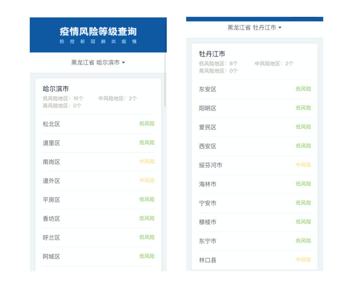 相比4月28日,哈尔滨市道里区、牡丹江市西安区已下调至低风险。牡丹江市林口县为新增中风险区域。