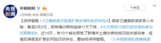 国家卫健委新闻发言人米锋:截至5月2日,现有确诊病例连续11天下降,今天报告12例无症状感染者为近期最低。近14天,有10个省份报告了新增本土确诊病例或无症状感染者,疫情反弹甚至扩散的风险仍然存在,要始终保持警惕。