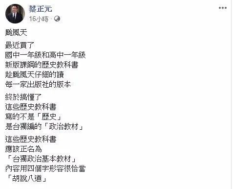 此前,蔡正元也曝光过台湾地区的历史教科书问题。去年9月底,蔡正元也是在社交媒体披露,他买了几本台湾地区新版的历史教科书,发现这根本不是“历史”,而是“台独”编的“政治教材”。