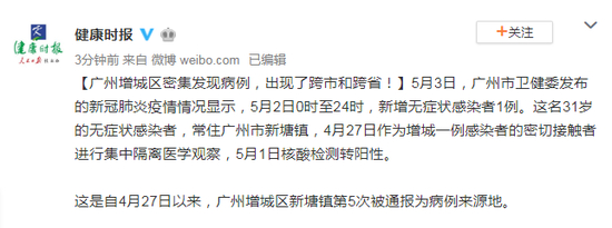 5月1日广州市新冠肺炎疫情情况通报,新增1例无症状感染者依然和广州市新塘镇有关:男,30岁,常住广州市新塘镇。