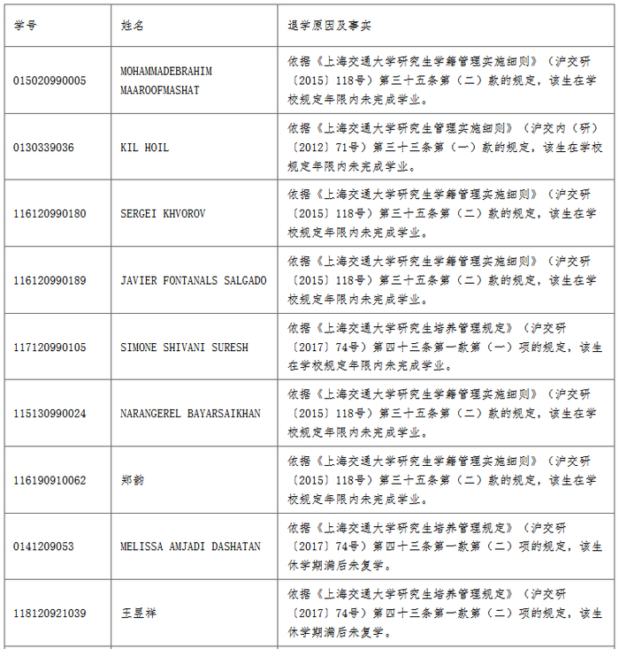 根据《普通高等学校学生管理规定》(中华人民共和国教育部令第41号)第五十五条第二款以及《上海交通大学研究生培养管理规定》(沪交研〔2019〕72号)第四十五条的规定,经2019年12月19日校长授权的专门会议研究决定,对符合应予退学情形的21名研究生作退学处理。
