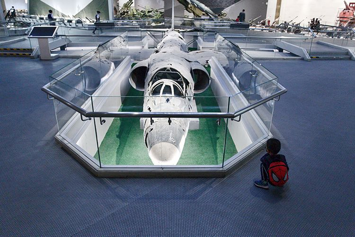 小朋友参观美国造U-2高空侦察机残骸。1962年1月,U-2高空侦察机开始对大陆进行侦查,人民空军针锋相对地开展反侦察斗争。9月9日,空军地空导弹部队在南昌市郊首次击落1架U-2高空侦察机。至1967年9月,共击落5架该型侦察机。这架飞机残骸是由四架飞机残骸拼成,主体为第4架。