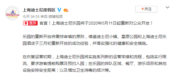 上海迪士尼度假区6日宣布,出于疫情防控的考虑,在恢复运营初期,上海迪士尼乐园将实施一系列新的运营举措和流程,包括实行人员限流、要求游客提前购票及预约入园;在乐园的排队区域、餐厅、游乐项目和其他设施,游客需保持安全距离,以及乐园将增加卫生消毒的频次等,以保障游客和演职人员的健康。