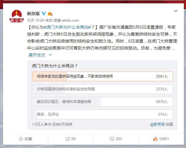 5月6日,新京报官微发起了一项“虎门大桥为何会晃动”的调查投票,在约1万名参与投票的网友中,有超过半数的网友选择“等待科学调查结果”。联想起在不久前的4月26日,武汉鹦鹉洲长江大桥桥体如波浪般晃动。接连发生的“大桥晃动”,公众自然关心也要追问,类似大桥发生晃动的情况是否会影响安全。