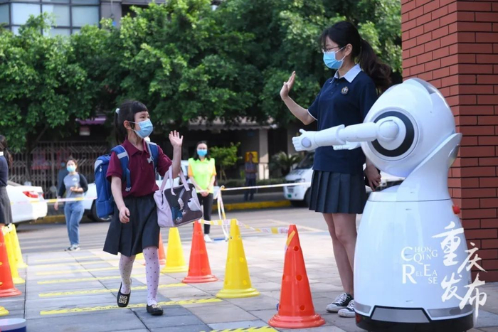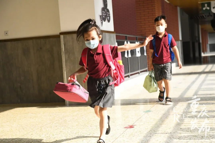 两江新区童心小学花园校区,一年级学生返校进入校园。