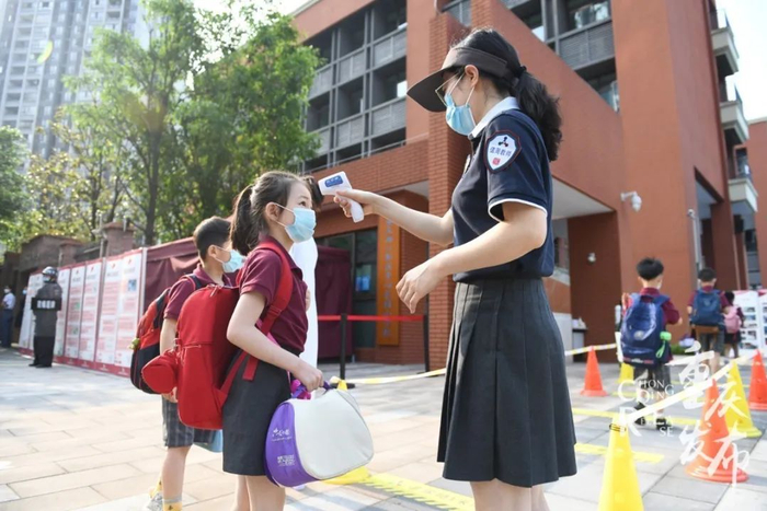 两江新区童心小学花园校区,工作人员正在进行晨检。