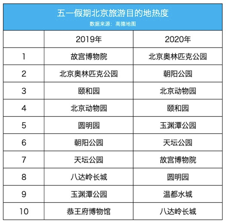 虽然各地景区陆续开放,但仍须按照不超过核定最大承载量30%的规定接待游客。受此影响,今年五一期间,北京热门目的地和去年有较大差别。去年五一假期人流量最大的故宫博物院,在5月1日重新开门迎客,但受限流影响,入园游客下降明显,取而代之的是观山赏水的公园、动物园等。高德数据显示,五一期间,北京客流最多的地方是奥林匹克公园、朝阳公园、北京动物园。