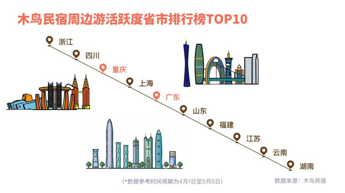 从木鸟民宿订单数据来看,位列周边游活跃度排行榜前10的目的地分别为浙江、四川、重庆、上海、广东、山东、福建、江苏、云南、湖南。从分布来看,浙江、四川、重庆、上海等地周边景点丰富,用户出游活跃度高。