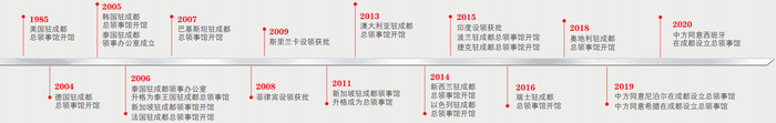 自1985年美国驻成都总领事馆率先落户成都以来,德国、韩国、泰国、法国等国家的领事机构接踵而至……