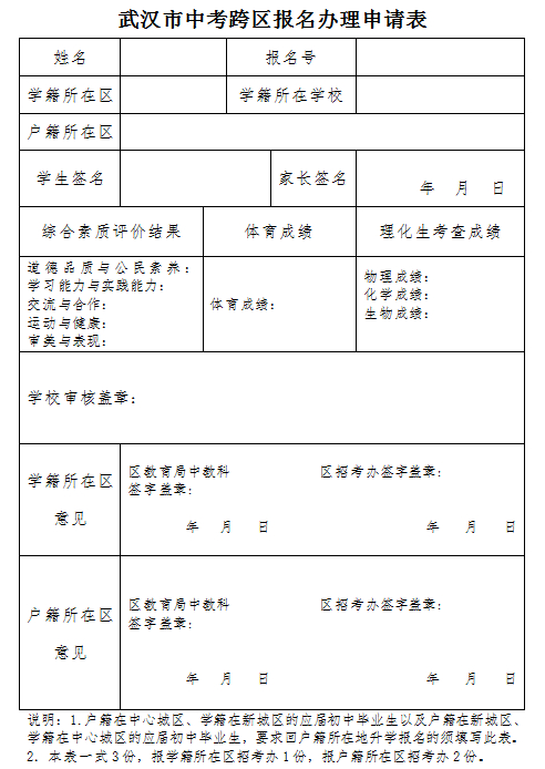 5月20-22日学生将《武汉市中考跨区报名办理申请表》(附件1)和户口复印件交学籍所在学校;学校审核后集中交区教育局中教科审核盖章;学校填写《武汉市中考跨区报名考生信息汇总表》(附件2),盖章后连同《武汉市中考跨区报名办理申请表》和户口复印件交区招考办。