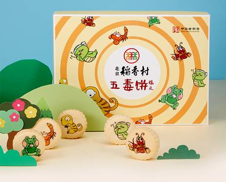 今年,老字号北京稻香村可爱爆棚,在继承传统“五毒饼”习俗的基础上,通过工艺创新,将蛇、蝎子、蜈蚣、壁虎、蛤蟆这五种动物的卡通形象印在饼面上,尤其是将它们开心、严肃、傲娇、呆萌以及惊讶的不同神情,极其生动地刻画出来。另外,根据时令特点以精选的椰皇芝士、翡翠松仁、香烤乳酪、黑金、榴莲入馅,不仅“颜值”高,味道也丰富,颇受消费者认可。