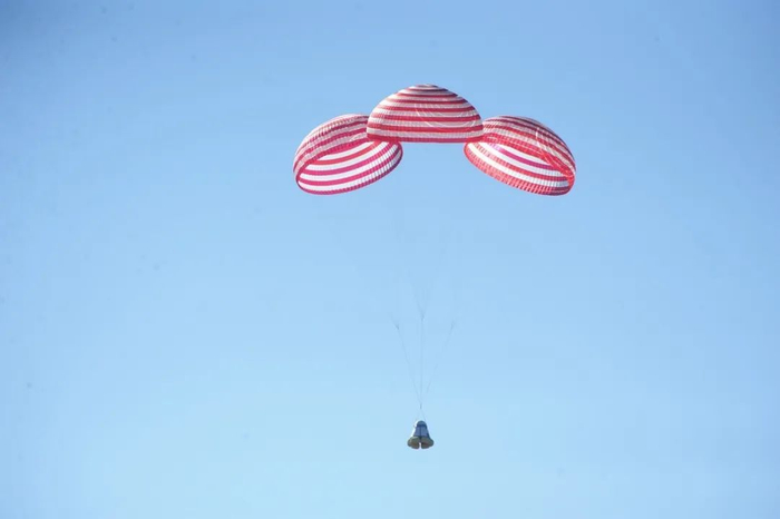 随着三只巨大的降落伞在酒泉东风着陆场上空打开,5月8日13时49分,试验船返回舱在预定区域成功着陆,搜救分队第一时间发现目标并到达着陆现场 开展处置,经现场确认,舱体结构完好。