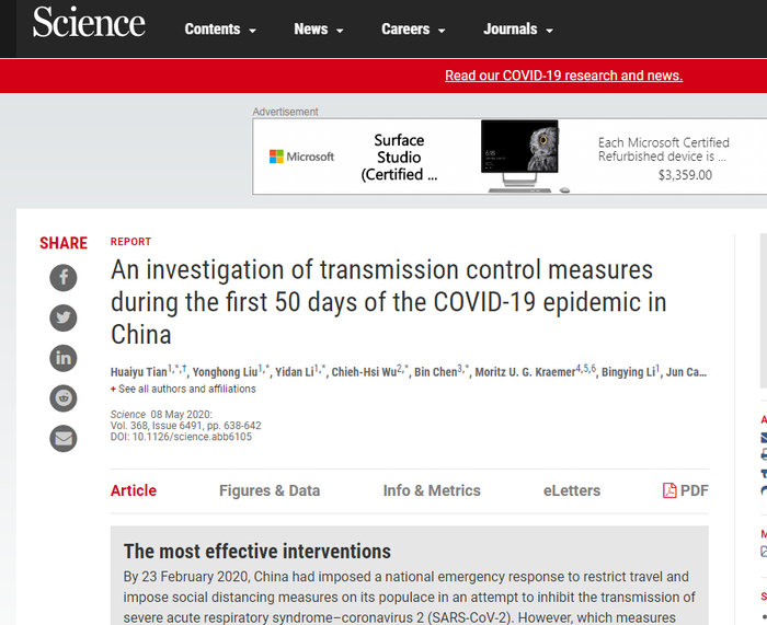 另一篇发表在重量级学术期刊《科学》的论文紧随其后,同样对中国的抗疫举措表达了高度肯定。它对2019年12月31日至2020年2月19日期间武汉控制措施的影响进行了定量分析并指出,在尚未有特效药出现之前,中国采取的强硬管制在短时间内控制了病例的激增。