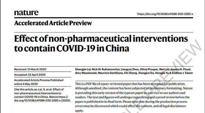 On May 4, a study published on Nature concluded that China had prevented millions of people from contracting the virus by late February with three major measures – intercity traffic restrictions, early testing and monitoring of possible patients, and actively practicing social distancing and personal preventive actions。