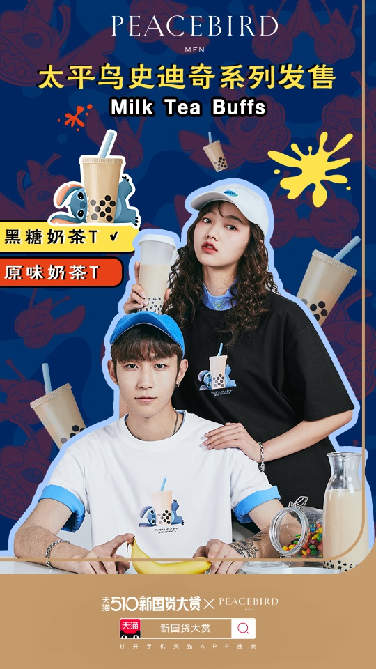在跨界联名已经不是“新鲜事”的当下,如何抓住消费者诉求,玩出新花样,是每个时尚品牌需要思考的命题。此次太平鸟推出的史迪奇IP合作系列,将年轻人喜爱的奶茶,传统美食小笼包、臭豆腐等元素与史迪奇形象融合,碰撞出新的“火花”。同时,通过直播带货,薇娅团队身着太平鸟史迪奇合作系列奶茶T恤,吸引超2000万网友在线观看。