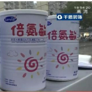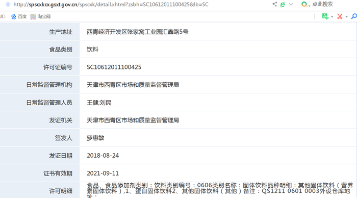 新京报记者根据网络图片信息查询到,“倍氨敏”的生产许可证号为SC10612011100425,委托方为湖南唯乐可健康产业有限公司,加工方为天津市德恒科技有限公司制造中心(曾用名为“天津市德恒科技有限公司张家窝加工厂”)。经查询,该产品类别为蛋白固体饮料,并非特殊医学配方食品。