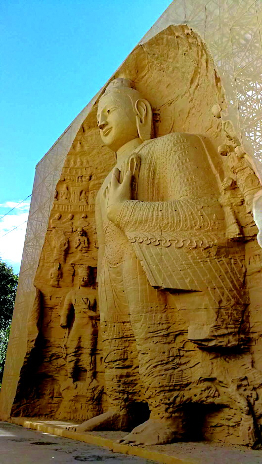 云冈石窟第20窟属云冈早期造像,“昙曜五窟”之一。由于窟顶崩塌,主像外露,俗称露天大佛。大佛两侧为立佛,其中东立佛保存完整,佛像着通肩衣,右手施无畏印,左手下垂提拎袈裟衣裾,面西偏南;但西立佛仅存下身膝以下局部以及头光局部,其余身躯已经坍塌,佛像原形态一直不为人知。