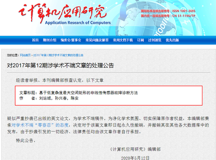 由四川省计算机研究院主办的《计算机应用研究》杂志,5月12日以编辑部的名义在官网发布《对2017年第12期涉学术不端文章的处理公告》。