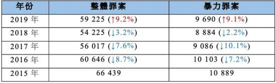 罪案数字显示,2019年录得的罪案总数是59225宗,较2018年(54225宗)上升9.2%。2019年的暴力罪案亦由8884 宗(2018 年)增加 9.1%至9690 宗。警方表示,罪案数字增加是因为示威活动衍生的罪案增加,以及警方应对日常防罪工作的资源被摊薄。