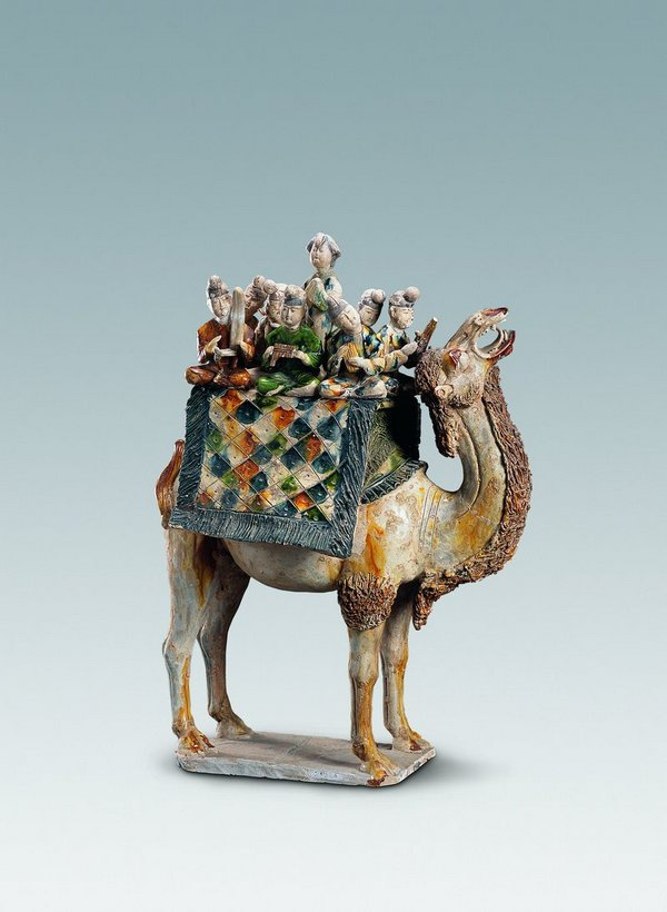 1959年,这尊唐三彩骆驼载乐俑在西安市西郊中堡村的唐墓中出土。其形为一尊昂首挺拔的骆驼,骆驼背上七位乐手围坐一圈,中间是一位丰腴婀娜的女子。七位男子意兴盎然地演奏着笛、箜篌、琵琶、笙、箫、管子等乐器,女子朱唇轻启,衣袖翩翩……