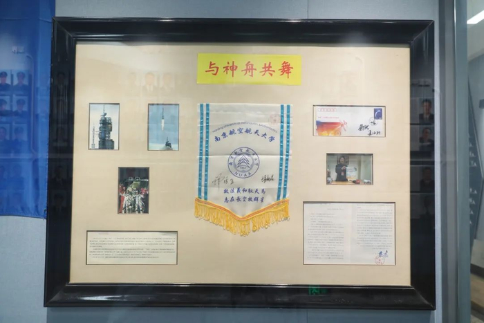 2005年10月12日,神州六号载人航天飞船从酒泉卫星发射中心发射升空,执行第二次载人飞行任务,这是人类史上第243次太空飞行。同比例缩小并有我校时任书记、校长签名的校旗,作为神舟六号的搭载物在太空遨游数天。飞天校旗虽小,却是所有南航人的共同骄傲。这是对南航多年来对中国航天事业贡献的一种认可,也激励着更多的南航人加入到中国的航天事业中,争做国之重器的创造者、南航精神的传承者。