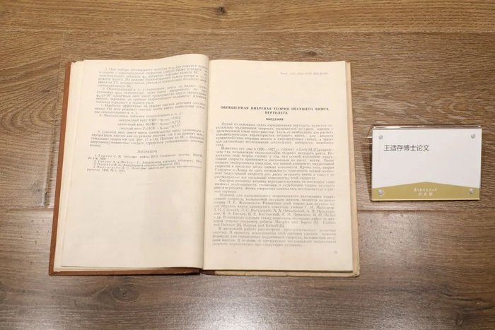 这是王适存教授当时在苏联上学时用俄文撰写的博士论文原稿。他在这篇论文中首次提出了广义涡流理论,也称“王适存涡流理论”,这也奠定了他在世界直升机界的泰斗地位。毛主席曾去苏联,还发表过一次非常有名的讲话:“你们是八九点钟的太阳,世界是我们的也是你们的,但归根到底还是你们的”,而王适存就在现场聆听。