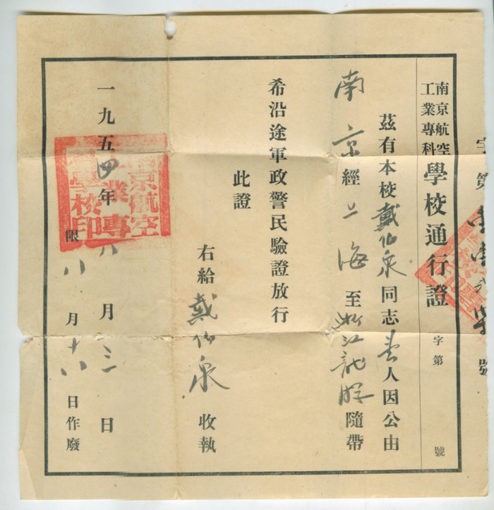 千万别小瞧了这张泛黄的文件,它可是建校初期航专颁发的通行证。由于航专浓厚的军工背景,这小小的通行证在社会上也具有强大的效力,所至之处畅通无阻。