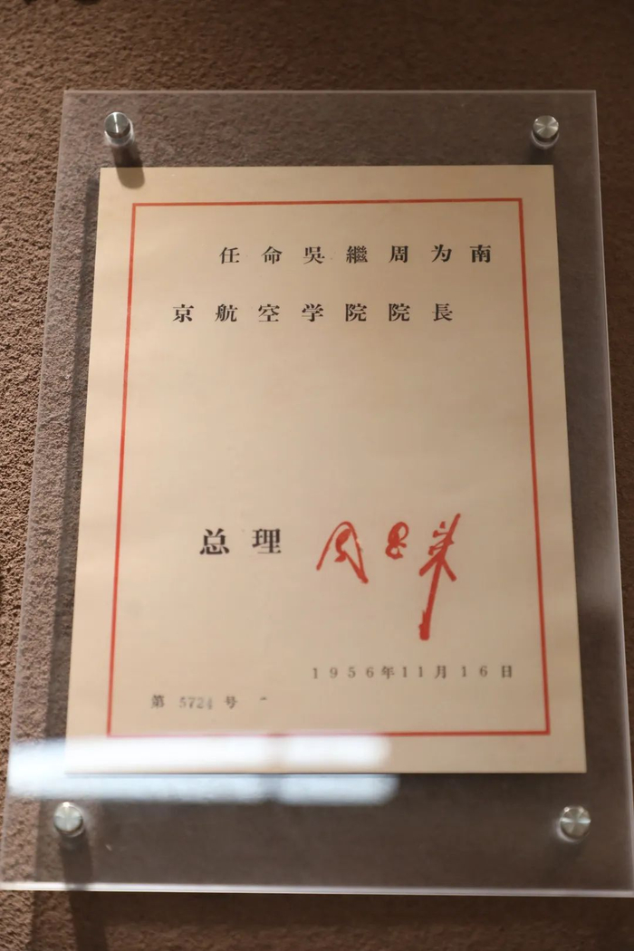 1956年6月,国务院第四十一次会议讨论决定,吴继周同志任南京航空学院院长兼党委书记。1956年11月16日,国务院总理周恩来亲自签发第5724号国务院任命通知书,任命为吴继周为南京航空学院院长。