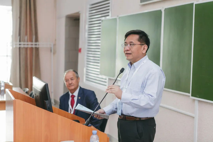程晋教授(左二)与俄罗斯科学院通讯院士Sergey Kabanikhin(左一)联合举办国际学术会议,并做主旨演讲