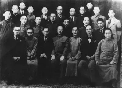 1938年西南联大负责人与教员合影。(前排左起黄钰生、李继侗、蒋梦麟、黄师岳、梅贻琦、杨振声、潘光旦,二排右三为闻一多)