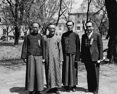 1947年4月27日,清华大学36周年校庆,梅贻琦与时任北京大学校长胡适、原西南联大训导长查良钊、原南开大学秘书长黄钰生的合影。这是原西南联大三校(北京、清华、南开)恢复后,清华从昆明回北平清华园第一次举办校庆。
