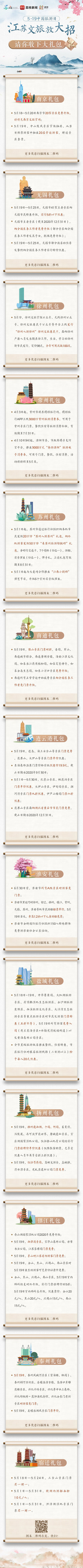 长图《江苏文旅放大招 请你收下大礼包》详细罗列了今年中国旅游日江苏十三地市重点推出的优惠活动,扫描图末二维码可查询更多优惠信息,2020年“中国旅游日”江苏惠民政策以各地文化和旅游行政部门官方发布为准。