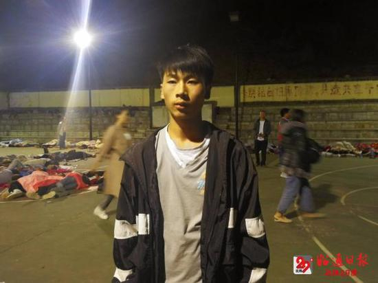 初三学生陈有全是小河镇拖车村横梁子村民小组的,他家离学校有15公里,陈有全长期住校,撤离到安全地带后,他第一打电话给父母报平安,询问父母的安危。这次地震让他最为感动的是,同学们都非常的团结,一床被子几个人分着盖,生怕对方冷到。陈有全哽咽地说:“现在到了半夜,老师们都在旁边守护着我们,帮同学们盖被子,老师们也有家人,这个时候也还顾着我们,让我们很感动。”每隔十分钟就有特警在学生们睡觉的地方巡逻,这让他们倍感安全。