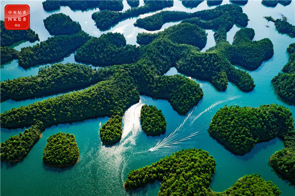 国家5A级旅游景区杭州淳安千岛湖碧波万倾,千岛竟秀,群山叠翠,乘坐快艇穿行湖上,能感受到“千岛碧水画中游”的意境。(杭州市淳安县纪委监委供 余诗祥 摄)