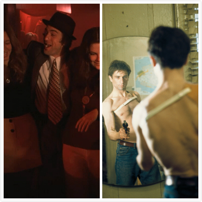 在1973年的影片《穷街陋巷》中,他以碎嘴子、戴着猪皮帽、系着宽领带,搂着两个年轻女子的手臂向前踱步的方式来演绎小人物乔尼,很符合片中随时准备逃跑的躲债小子身份。评论家认为,这个“话痨”形象已经超越白兰度的方法派式的范畴,德尼罗恰如其分地完成了他成为70年代白兰度的第一个伟大的亮相! 随后德尼罗在1976年影片《出租车司机》中饰演越战退役士兵特拉维斯,片中他再愤世嫉俗再具有时代创伤感,最令人难忘的镜头却不是他最后的“替天行道”式大开杀戒,而是他对着镜子喃喃自语“你在和我说话”的沉浸式体验。