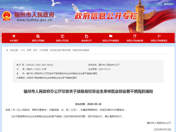 5月18日,福州市出台了《关于鼓励高校毕业生来榕就业创业的若干措施》。国内“双一流”高校、境外著名大学、国家级研究机构全日制硕士研究生、本科毕业生来福州市企业工作,给予硕士每人3万元、本科生每人1.5万元奖励。高等院校、中等专业学校、职业院校和技工学校毕业生(含教育部认定的留学归国取得同等学历),可在福州市落户,不受年龄及就业创业限制。2020年—2023年,每年安排C型保障对象的公共租赁住房和安居型商品住房不少于2000套。