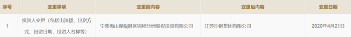 张家港鸿运投资有限公司(下称“鸿运投资”)工商信息显示,其于4月21日发生投资人变更,原独资股东宁波梅山保税港区锦程沙洲股权投资有限公司(下称“锦程沙洲”)退出,江苏沙钢集团有限公司(下称“沙钢集团”)入主成为新任独资股东。
