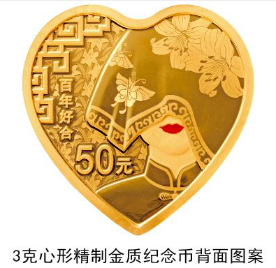 从图案看,6枚纪念币中有心形纪念币两枚,一枚是3克心形金质纪念币,背面图案为新娘、百合、窗棂等组合图案,并刊“百年好合”字样及面额,最大发行量1万枚;另一枚是30克心形银质纪念币,背面图案为百合与同心锁等组合图案,并刊“百年好合”字样及面额,最大发行量2万枚。