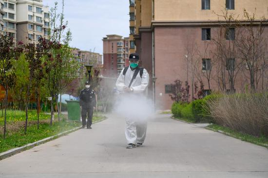 5月16日,在吉林市船营区一小区内,工作人员进行消杀工作。新华社发