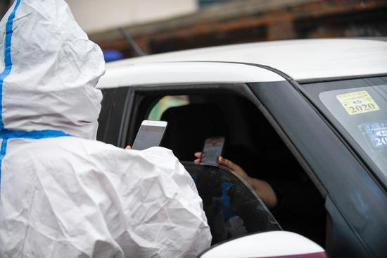 5月19日,在吉林省吉林市高新区一小区,社区工作人员为小区居民扫描健康码。新华社发
